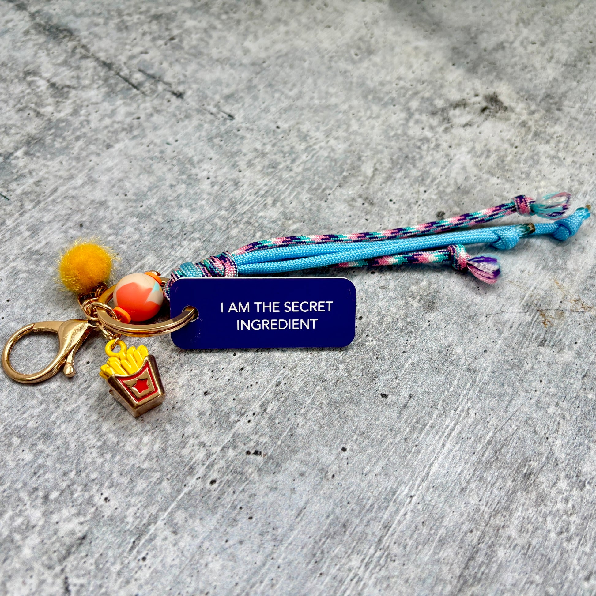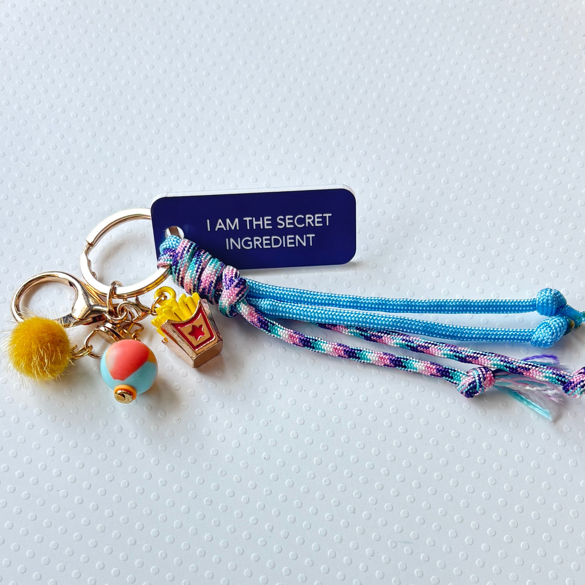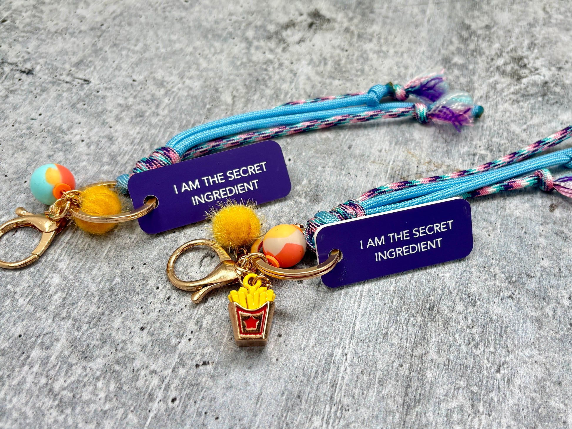 Gold hardware, purple tag, light blue and multi para cord tassel, yellow pom, 15mm silicone bead.