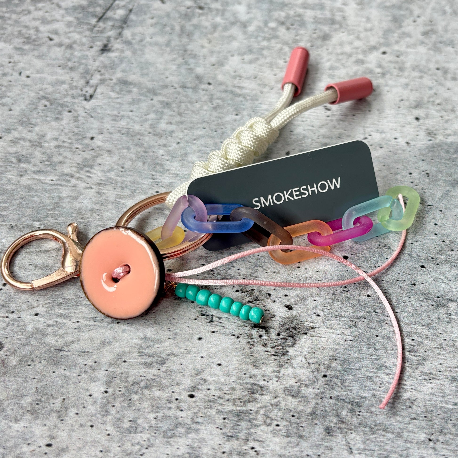 Rose gold hardware. Grey acrylic tag. Pink enamel button tied with pink satin string. Turquoise seed bead stack. Frosted acrylic chain link. White paracord knotted tassel with pink powder coat end caps.