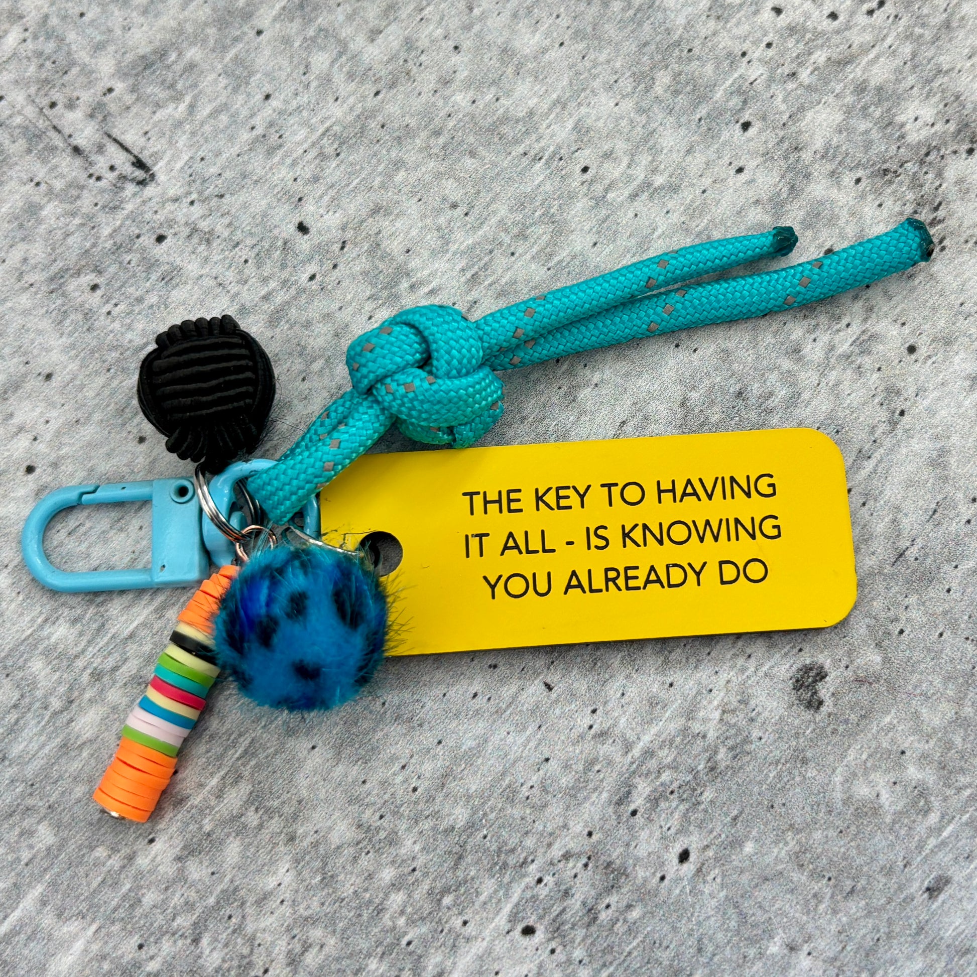 Light blue powder coat hardware. Yellow acrylic tag. Black silk knot charm. Electric blue fuzzy leopard mini pom. Orange multi color bead stick stack. Blue w/ reflective thread paracord knotted tassel.