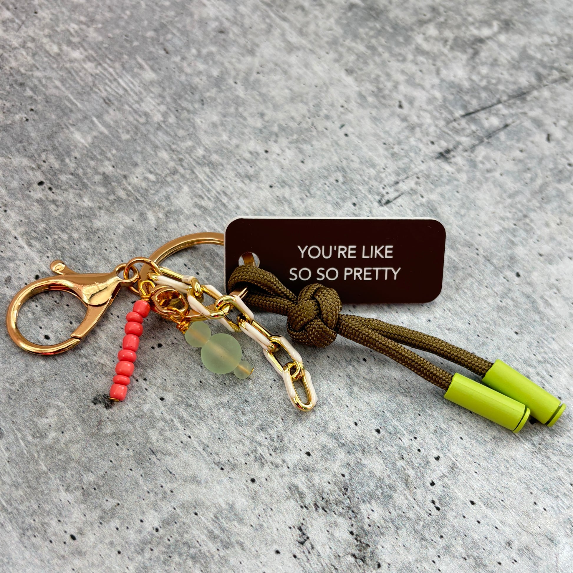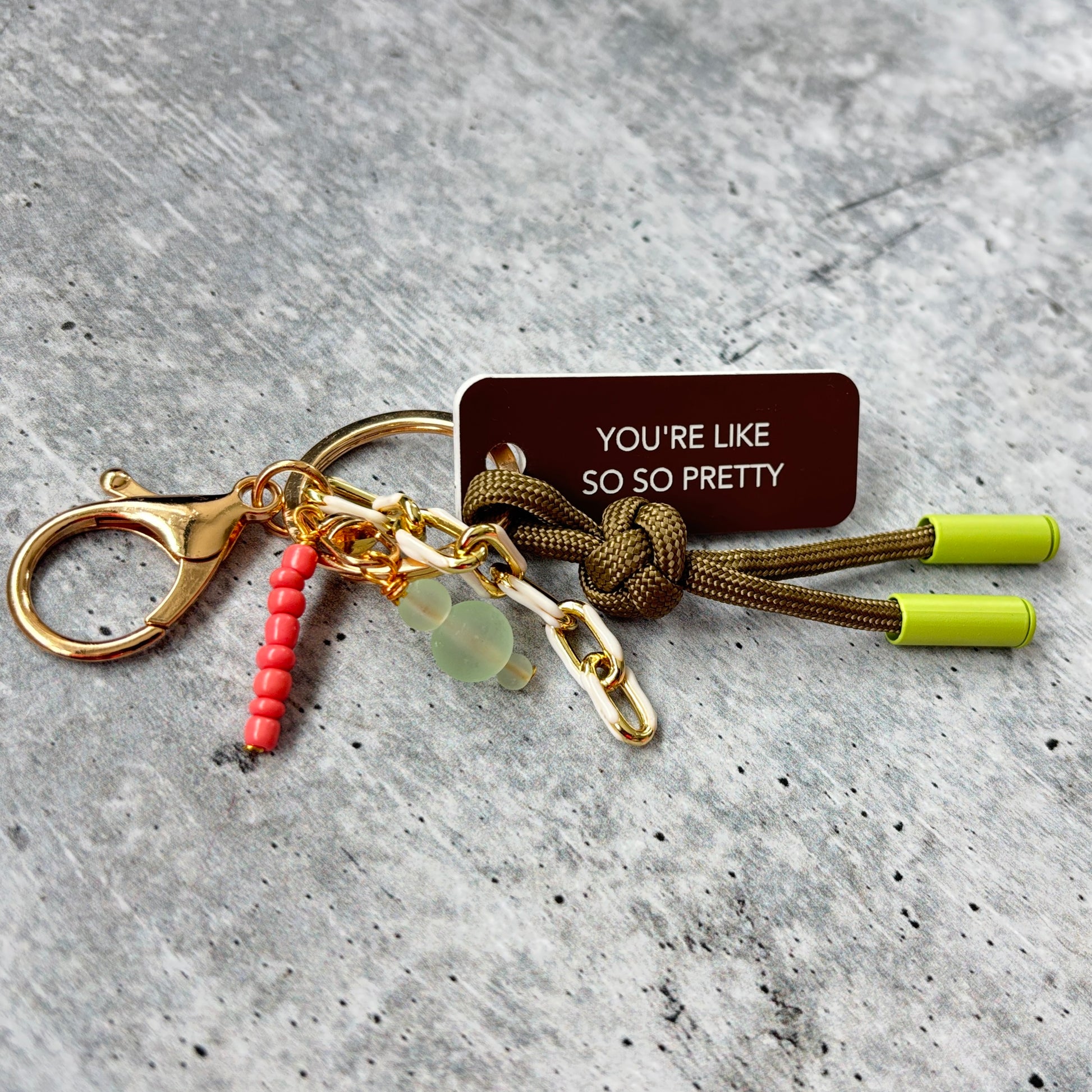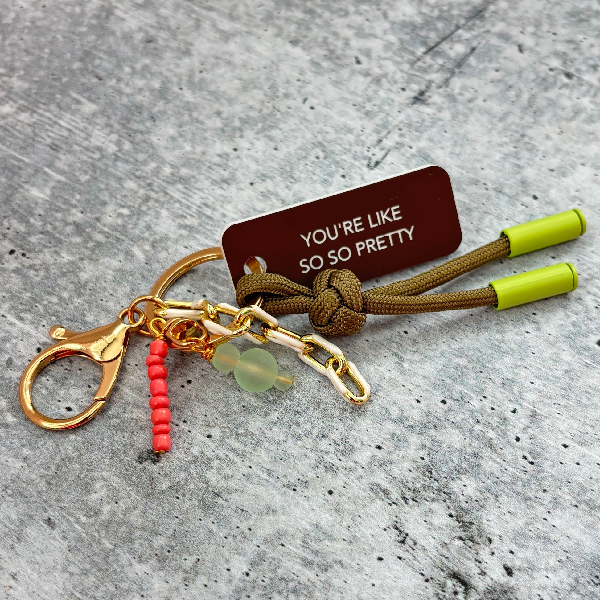 Gold metal hardware. Brown acrylic tag. Gold chain link with cream enamel accents. Coral seed bead stack. Frosted mint glass bead stack. Khaki paracord knotted tassel with lime powder coated caps.